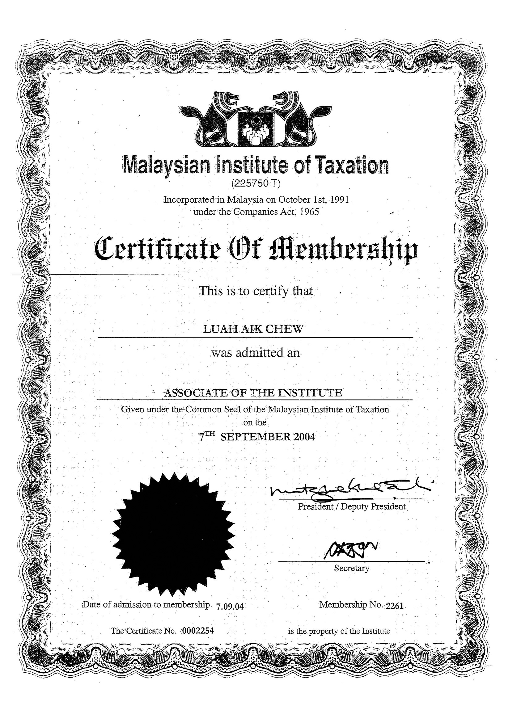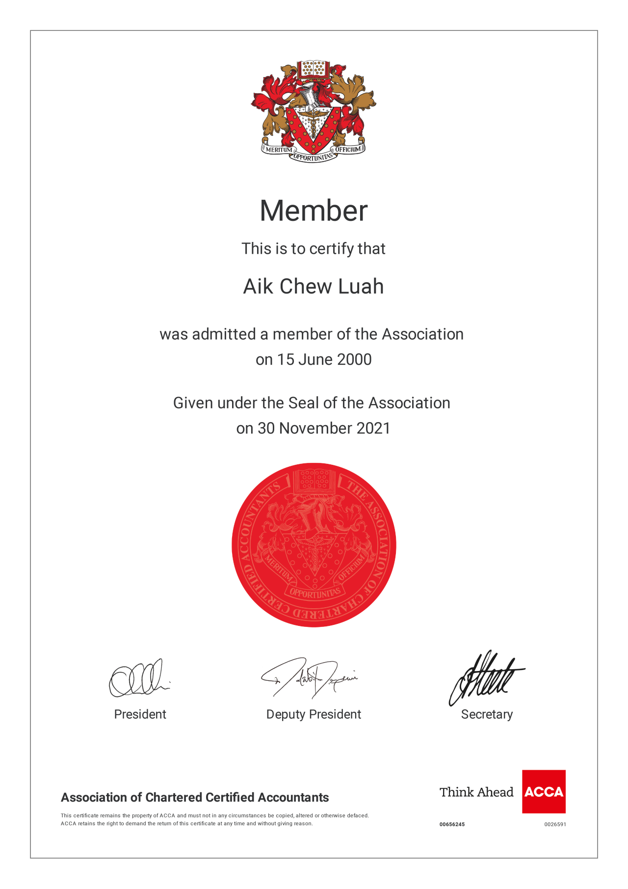 He was a past member of Johor Committee member of the Malaysia Institute of Accountants (MIA), and affiliate of MAICSA Malaysia and presently acting as a sub-committee member with the Chartered Taxation Institute of Malaysia (CTIM) for the Johor Committee. He currently serves as a council member of Johor Associated Chinese Chamber of Commerce & Industry (JACCCI) and joined the SME committee of the Associated Chinese Chamber of Commerce & Industry of Malaysia (ACCCIM). He presently leads the Johor Tax Committee in his 3rd term since 2013.